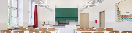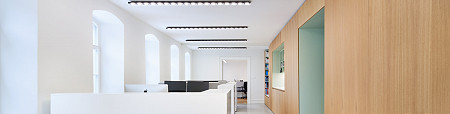 Innenräume erhielten eine behutsame Oberflächenüberarbeitung unter besonderer Berücksichtigung des Denkmalschutzes, inklusive der Wiederherstellung historischer Wandoberflächen, Einbauschränke und Verzierungen. Brandschutztechnisch wurden F90-Decken und akustisch wirksame Gipskarton-Lochdecken als freistehende Deckensegel eingebaut, sodass die ursprünglichen Geschosshöhen erlebbar bleiben. Bodenbeläge wurden nur punktuell überarbeitet, um möglichst viel Originalsubstanz zu erhalten.