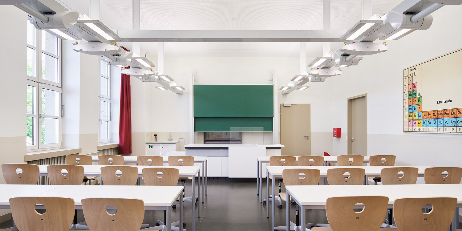 Die Teilsanierung des historischen Rückgebäudes des Fichte-Gymnasiums in Karlsruhe umfasste die Modernisierung der angebauten naturwissenschaftlichen Fachräume Biologie, sowie Chemie. In engem Austausch mit den Nutzern wurden sie komplett neukonzipiert, schadstoffsaniert und auf den neuesten technischen sowie brandschutztechnischen Stand gebracht.