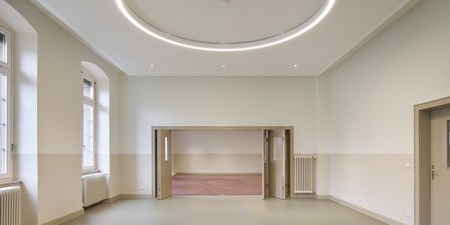 Innenräume erhielten eine behutsame Oberflächenüberarbeitung unter besonderer Berücksichtigung des Denkmalschutzes, inklusive der Wiederherstellung historischer Wandoberflächen, Einbauschränke und Verzierungen. Brandschutztechnisch wurden F90-Decken und akustisch wirksame Gipskarton-Lochdecken als freistehende Deckensegel eingebaut, sodass die ursprünglichen Geschosshöhen erlebbar bleiben. Bodenbeläge wurden nur punktuell überarbeitet, um möglichst viel Originalsubstanz zu erhalten.