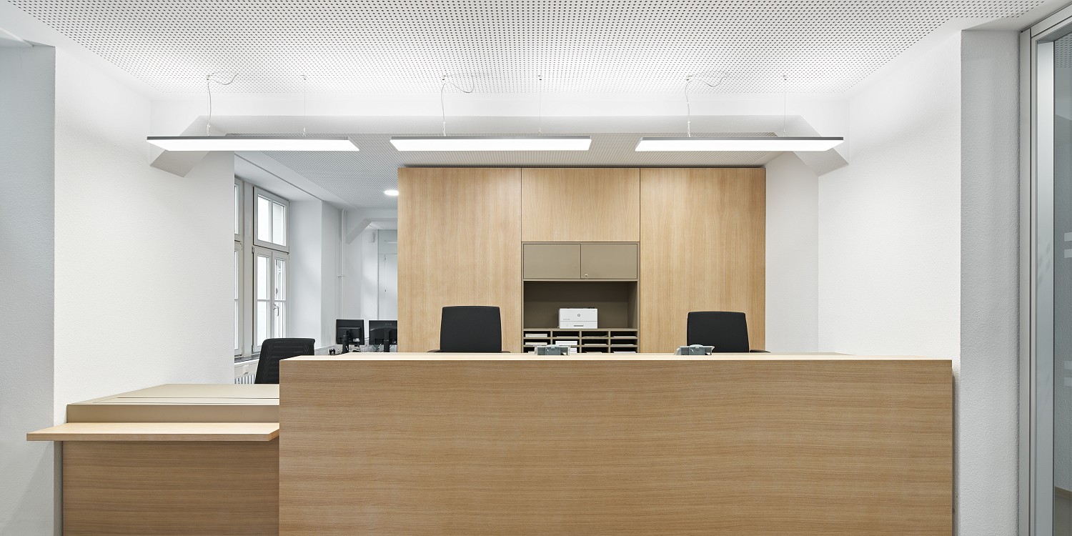 Damit Kommunikation und Partizipation ein ihrer Bedeutung angemessenes Gewand erhalten sollte das Bürgerbüro des Ordnungsamtes neu strukturiert und möbliert werden. In Folge dessen entstand eine Infotheke die als Möbel nicht nur den Zwecken der alltäglichen Nutzung dienen sondern auch als Designelement den Raumeindruck positiv verändern sollte. Es entstanden drei feste Arbeitsplätze auf einem Podest das durch eine Theke und durch eine Arbeitsinsel umrahmt wird. Der größere Arbeitsblock im Rücken der Theke verfügt neben viel Stauraum in Schüben und Fächern über eine zentrale großformatige Magnettafel und ist von beiden Seiten zugänglich. Das Möbel wurde in dunkel durchgefärbten MDF-Platten ausgeführt auf der Thekenseite ist das Möbel furniert. Alle Fächer und Schubladen wurden den Bedürfnissen der Nutzer angepasst um den Workflow der Mitarbeiter optimal zu unterstüzten.