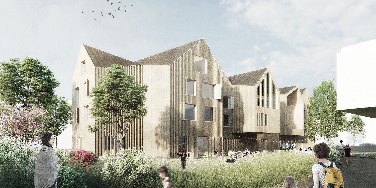Doch es entstehen keine Solitäre, die kleinen Häuser stehen dicht an dicht. Und so, wie Häuschen an Häuschen zusammenrückt, so verbindet sich das Einzelne zu einem Ganzen, einer engen Nachbarschaft, die aus der Schwäche des Einzelnen die Stärke der Gemeinschaft macht. So wie jede Familie eine eigene Dynamik mitbringt, jede Person mit Ihren unterschiedlichen Emotionen und Erfahrungen ankommt, so stehen die Baukörper sinnbildlich für die Vielfältigkeit der Bewohner. Dabei spielen sie empfindsam mit dem archetypischen Bild des Hauses, dem Inbegriff des Wohnens, der Vertrautheit, des Heimkommens.