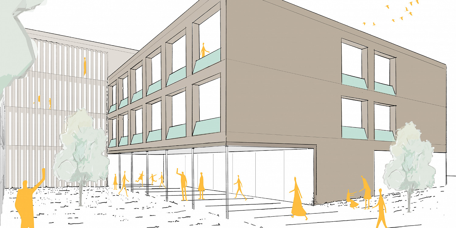 Die Erweiterung setzt sich nördlich des Bau A in die Schnittstelle der bestehenden Baukörper, um als kompakt ausgebildeter Neubau eine eindeutige Wahrnehmung und Adressierung aus dem öffentlichen Raum zu schaffen. Es wird bewusst das Zentrum des Baufeldes besetzt, um der bestehenden Grünstruktur angemessenen Raum zu geben und mit minimalinvasiven Eingriffen den Campuscharakter zu stärken.