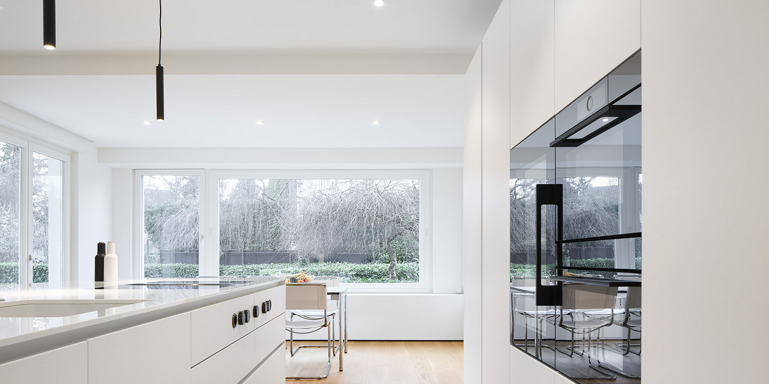 Auf beiden Geschossen wurden hochwertige Einbaumöbel eingebaut. Das neue Treppenelement dient gleichzeitig als Garderobenschrank und die offene Küche bildet das Herzstück zwischen Wohn- und Essbereich.
