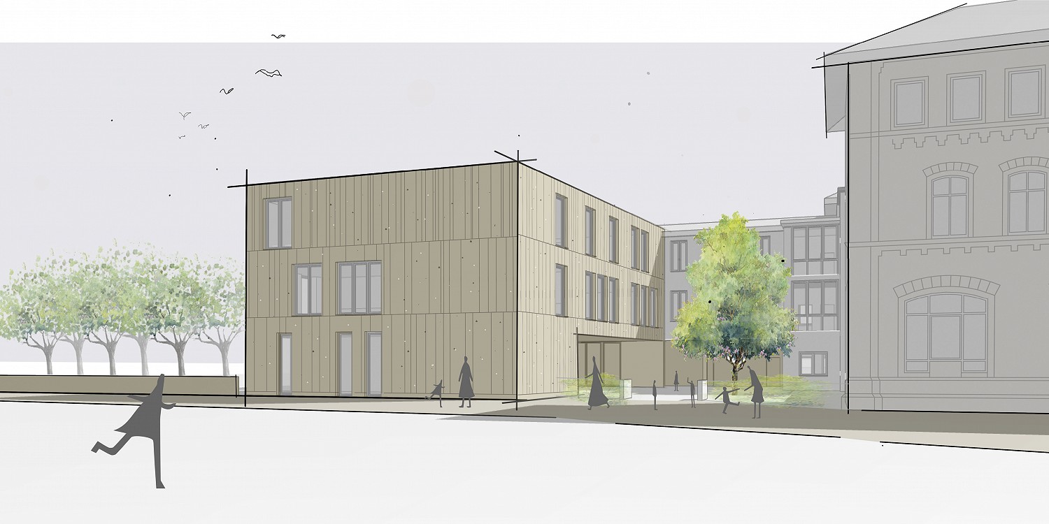 Der neue Baukörper verbindet sich mit dem bestehenden Schulgebäude zu einer Einheit und formt städtebaulich einen Solitär um die Gestaltung des Altbaus mit einzubeziehen. Der neu entstehende Innenhof dient als Eingang und zentraler Organisator des gesamten Schulhofes, von hier aus erschließen sich die einzelnen Zugänge zum Gebäude. Als Querriegel dockt das Gebäude an den Anbau aus den 60er Jahren an und führt formal die bestehende Schulstruktur fort. Zur Ostseite entsteht eine neue Schaufassade, welche mit der Symmetrie des Altbaus spielt. Durch den reduzierten Fußabdruck des Anbaus auf Schulhofebene ergibt sich ein überdachter Außenbereich, der den Schulhof konzeptionell in zwei Bereiche aufteilt, ohne diese räumlich voneinander zu trennen.