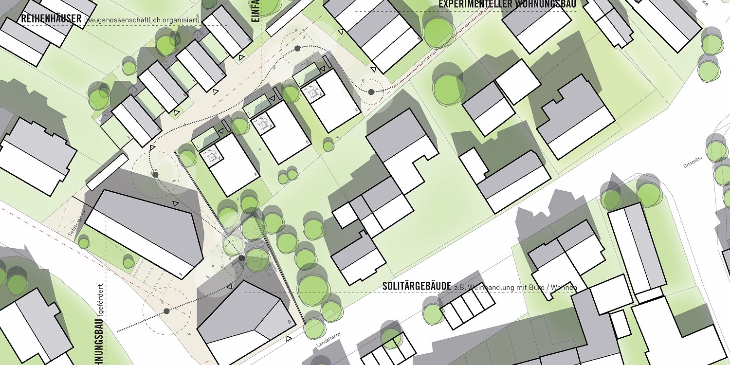 Das Ergebnis ist ein Quartier, das die Grundprinzipien und Spezifitäten Ettlingens durch die überarbeitete suburbanen Typen Einfamilienhaus, Reihenhaus, Geschosswohnungsbau und gemischt genutzte Solitärtypen ins Zentrum Bruchhausens bringt. Auch wenn die Lösung sehr real und umsetzbar erscheint, so ist der Entwurf doch als prototypisches Modell für die zukünftige Entwicklung gedacht.